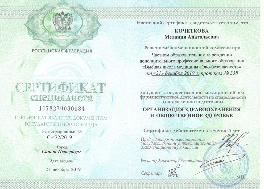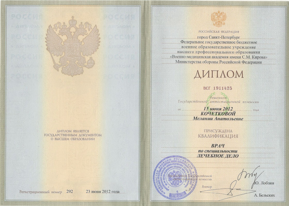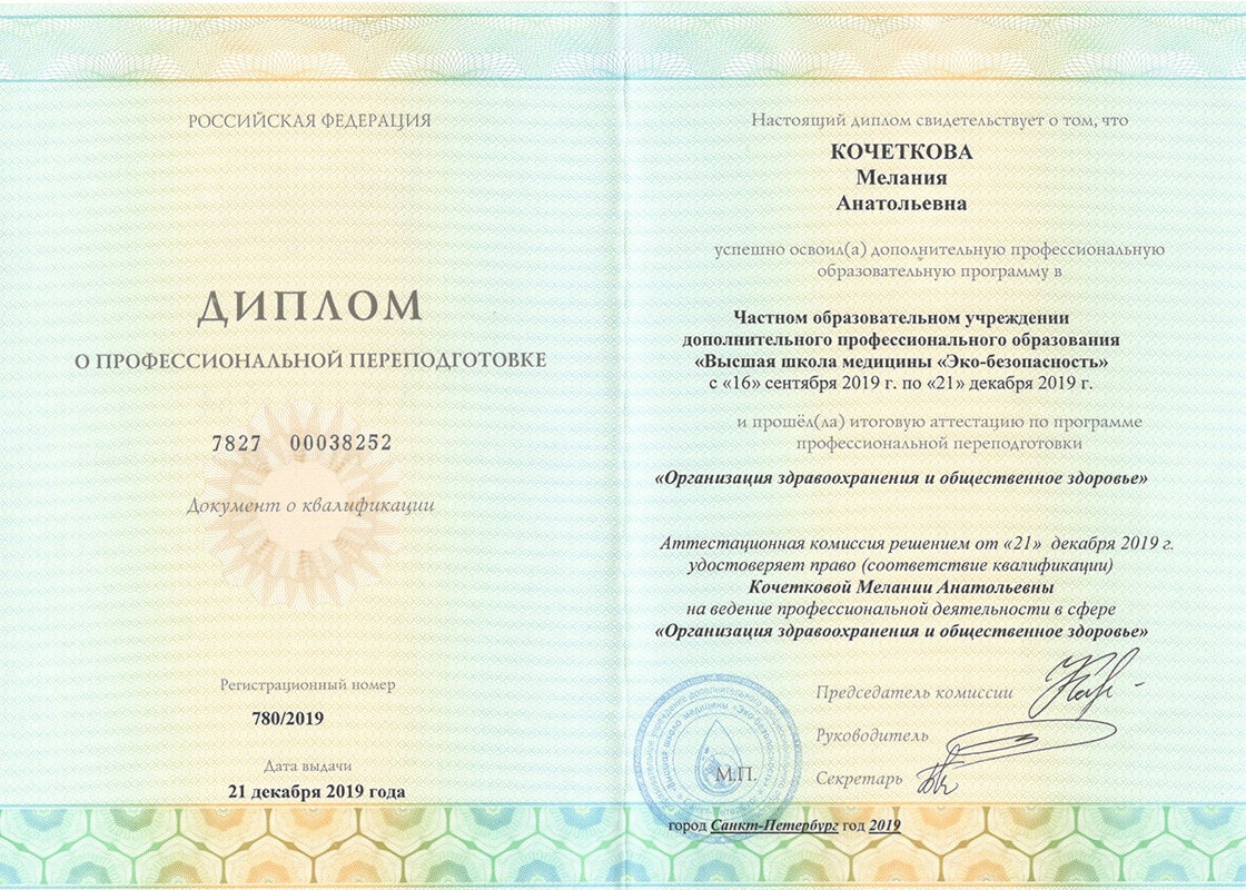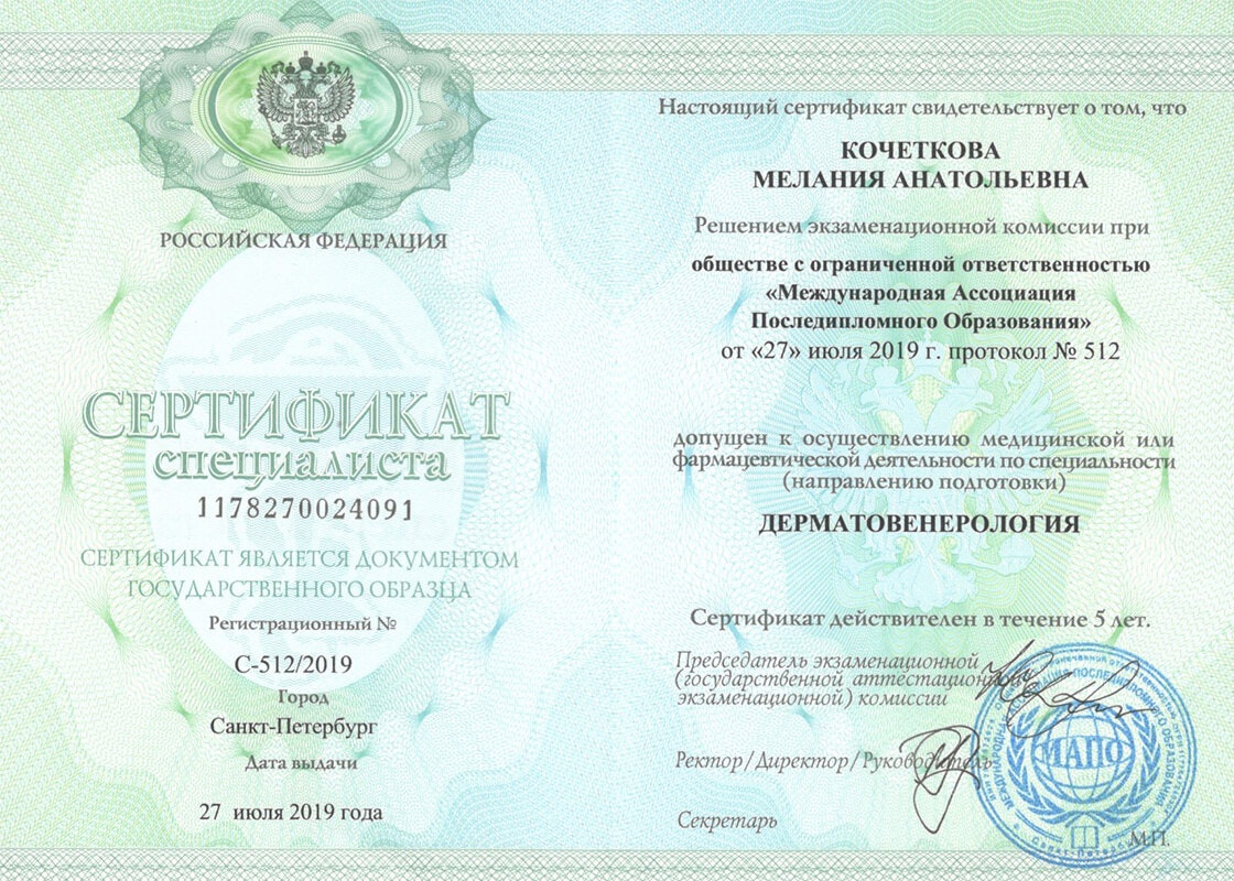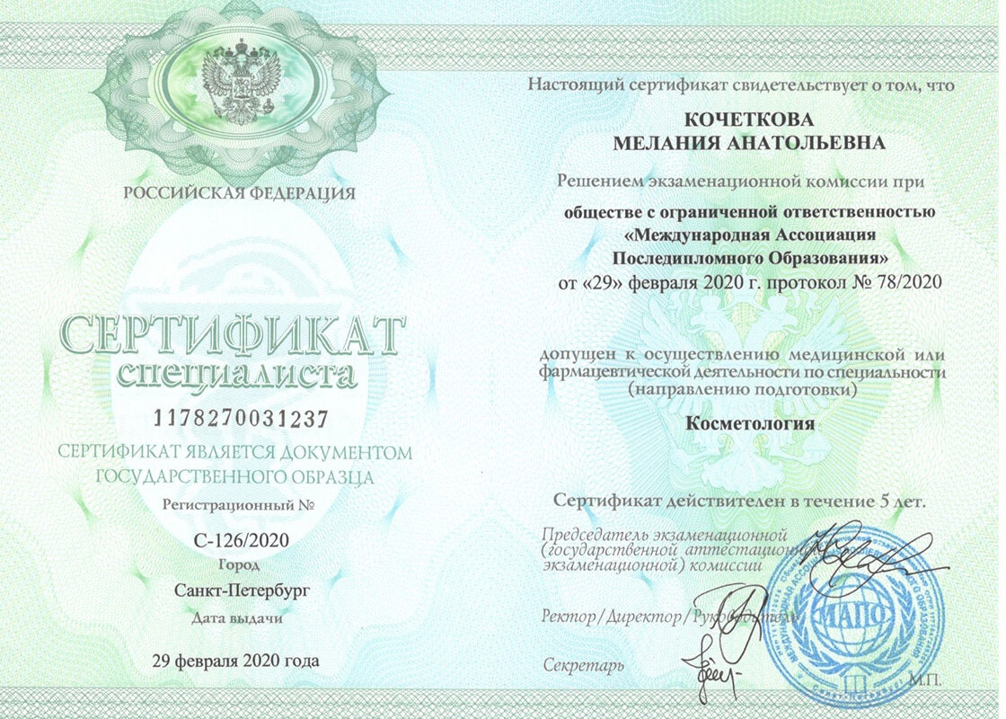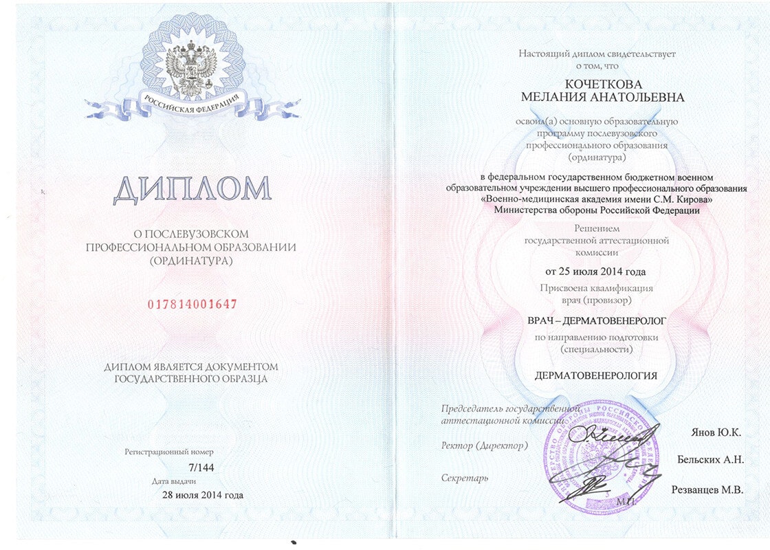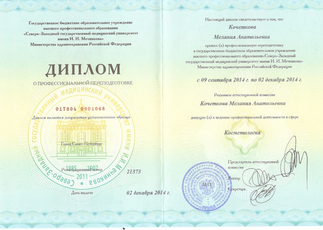 Квалификация врач - дерматовенеролог, допущена к ведению профессиональной деятельности в сфере медицинской косметологии.